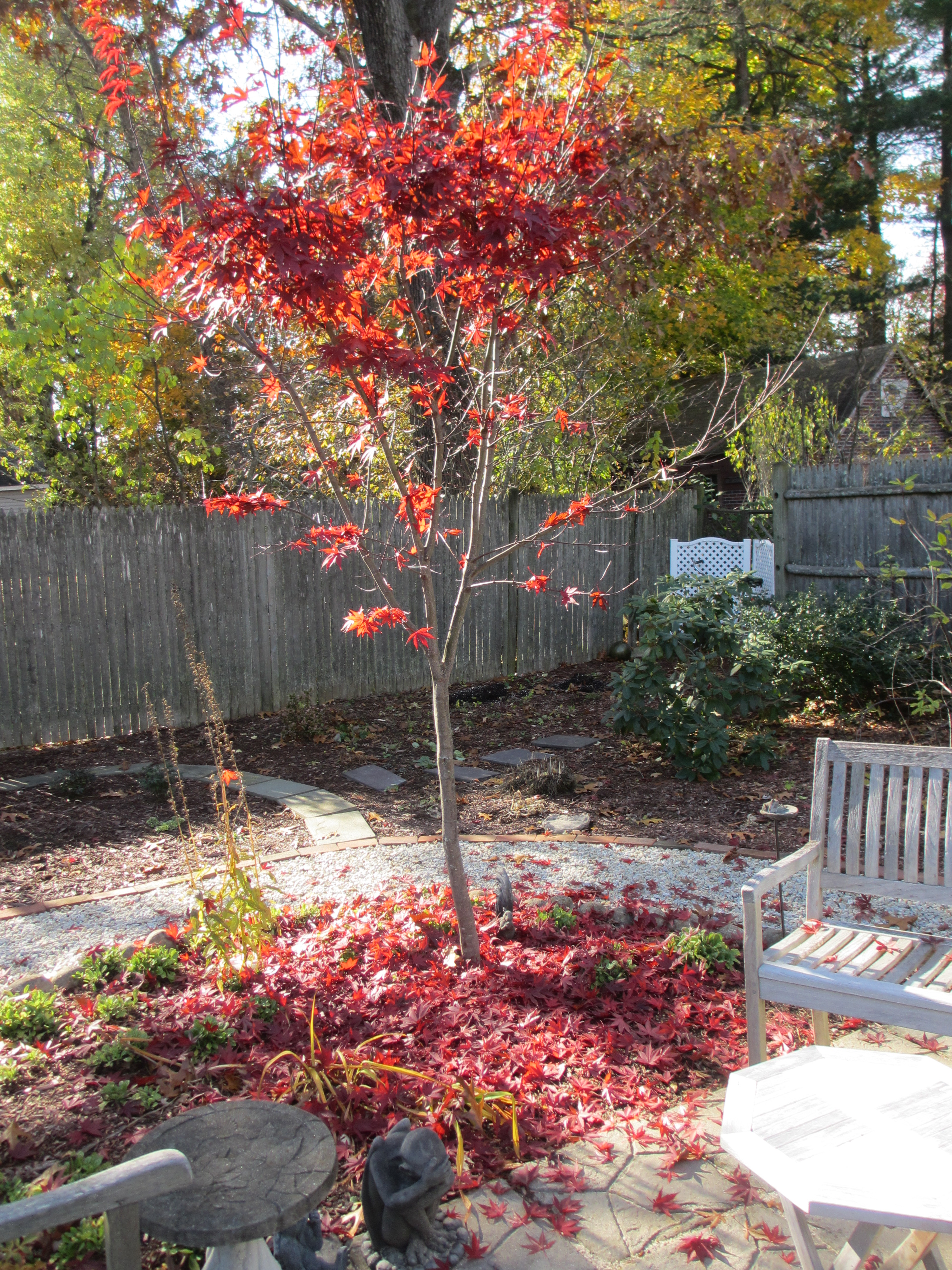 It really did happen overnight. Yesterday morning, the maple tree that was highlighted in my blog on Sunday, dropped most of its leaves. They fell straight down to the ground, creating a beautiful carpet of red leaves. (The little gargoyle statue sitting nearby seems to not want to look!)